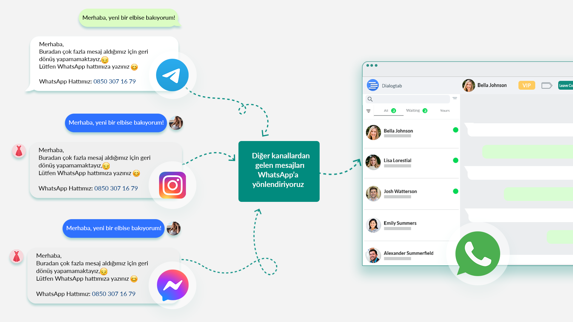 WhatsApp'tan ayrılmadan Multi-Agent ve sipariş sistemini kullanmaya başlayın. Dialogtab, WhatsApp Chrome Uzantısı ile sohbetleri sekmeler halinde düzenleyerek müşteri hizmetleri üretkenliğini en üst düzeye çıkarır. Aynı zamanda Temsilciler, WhatsApp web aracılığıyla müşterilerinizden kolayca sipariş alabilir.